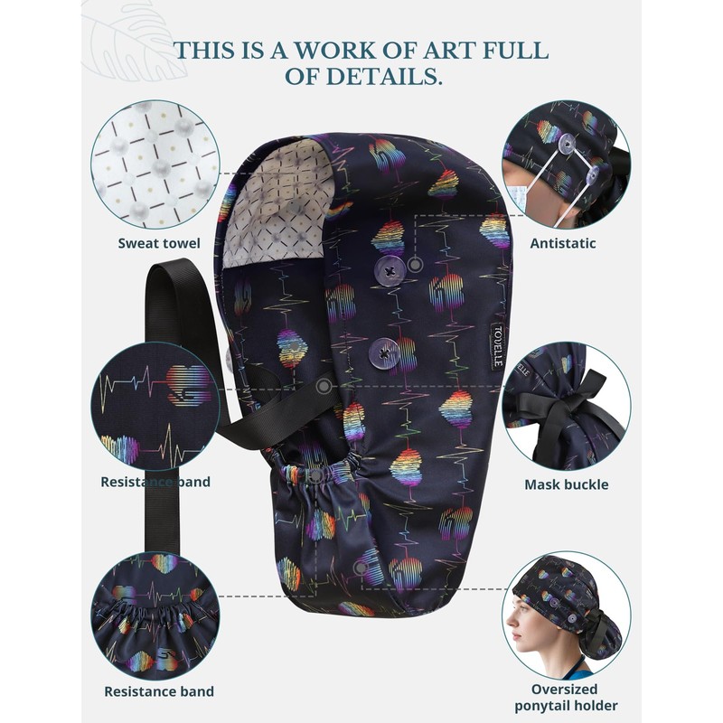 - TOVELLE adjustable scrub cap ponytail women is ideal for nurses, surgeons, dentists, and healthcare professional. The ECG patterns add a touch of fun, making them a perfect choice for operating rooms, clinics, or hospitals. Whether it's for long working hours or maintaining a professional image, this ponytail scrub hats women can meet your needs