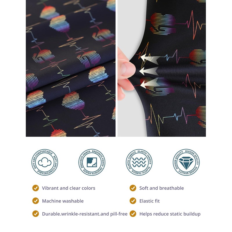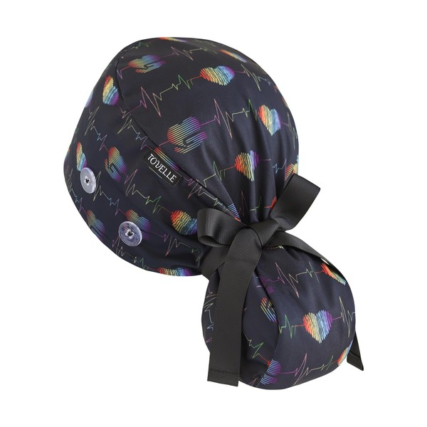 Scrub Caps Women Ponytail – Black ECG Rainbow Heart Double-Sided Printed Surgical Hat with Buttons and Sweatband, Soft Nurse Cap for Long Hair, Helps Reduce Static Buildup