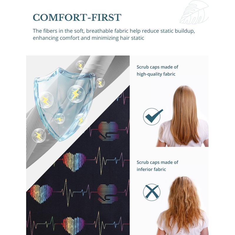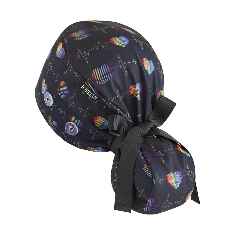 - Inspired by colorful heartbeat patterns, this scrub cap with ponytail features a vibrant double-sided printed scrub cap that combines professionalism with a touch of individuality. The back includes a ponytail pouch paired with a decorative bow scrub cap, which enhances the aesthetic and works with the inner elastic band for adjustable tightness. It accommodates various hairstyles and stays secure for nurses, doctors, and other professionals
