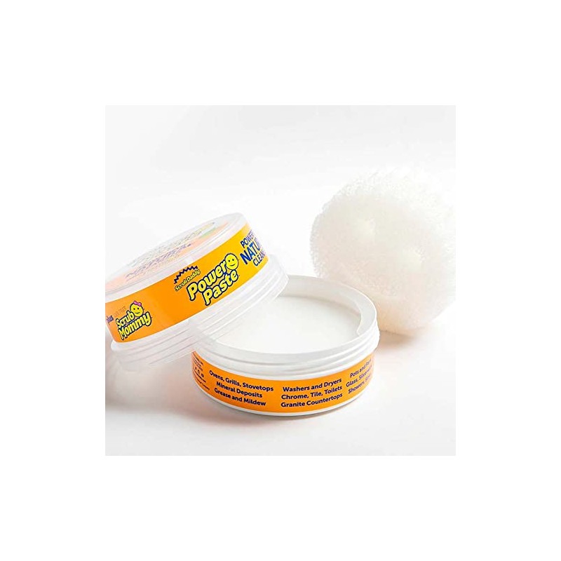 Pasta limpiadora + scrub mommy blanca (doble cara esponja+fibra) Ideal para limpiar hornos, parrillas, lavadoras , estufas, azulejos, baños , granito y remover la grasa y moho. Con delicioso aroma a Limón. La Scrub Mommy se puede lavar en la parte superior del lavavajillas; Esta se empezará a decolorar y degradar con el tiempo y uso. -No tóxica -No probada con animales -Biodegradable Se recomienda no combinar con otros liquidos limpiadores. ADVERTENCIAS: Probar en un espacio pequeño de la parte que se quiere limpiar. No apto para latón, cobre, acero inoxidable o barnizado blando. Mantener fuera del alcance de los niño.