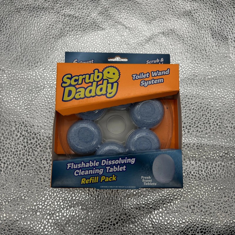 The Scrub Daddy Toilet Wand System Refills 6 Pack are flushable cleaning tablets that dissolve in water. They have a fresh scent and are designed to clean toilets. These tablets are compatible with the Scrub Daddy Toilet Wand System.