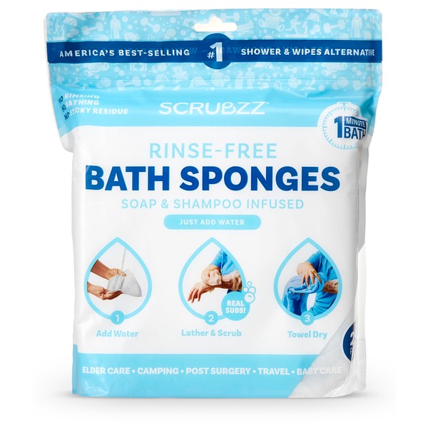 SCRUBZZ Rinse Free Bath Shower Sponge is a life changing product that will transform your bathing experience. This convenient and easy to use bathing sponge features a unique design that lets you bathe quickly and easily even when you don’t have a shower, soap ormore than 3 oz of water!! In short, Scrubzz gives you the complete shower experience without the need of much water!About This Product:- No Rinse Bathing Sponge-No rinse Soap and No rinse Shampoo are Infused Into The Sponge- Dampen with a Little Water & Rub sponge to create lather, Wipe with sponge, Dry with towel!- Single Use- Hypoallergenic & PH Balanced- Ideal For Hospitals, Medical Centers & People Who Suffer From Injuries- Great For Travel, Camping, Hiking & Emergencies- It will begin to lather, without the need for very much water at all. Once you've cleansed yourself with the sponge there is absolutely no rinsing required, making this a must have item to have on hand in emergency situations where water is scarce. The soap and shampoo used in these no rinse body wipes is gentle enough to ensure your skin will not dry or break out. These disposable bath sponges are also great as a facial cleansing sponge. At Scrubzz, our customers satisfaction is important to us. We know you will love this product. If for any reason you aren't completely satisfied, contact us so we can be of assistance.
