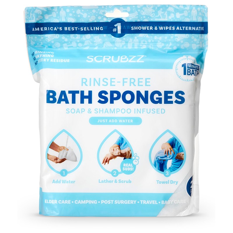 - Scrubzz cleansing sponge is a must in any BATHING ESSENTIALS kit! 25 Sponge ECONOMY PACK! NEW RESEALABLE ZIPLOC STYLE BAG!! Buy one now and start enjoying the convenience of Scrubzz NO RINSE WIPES!