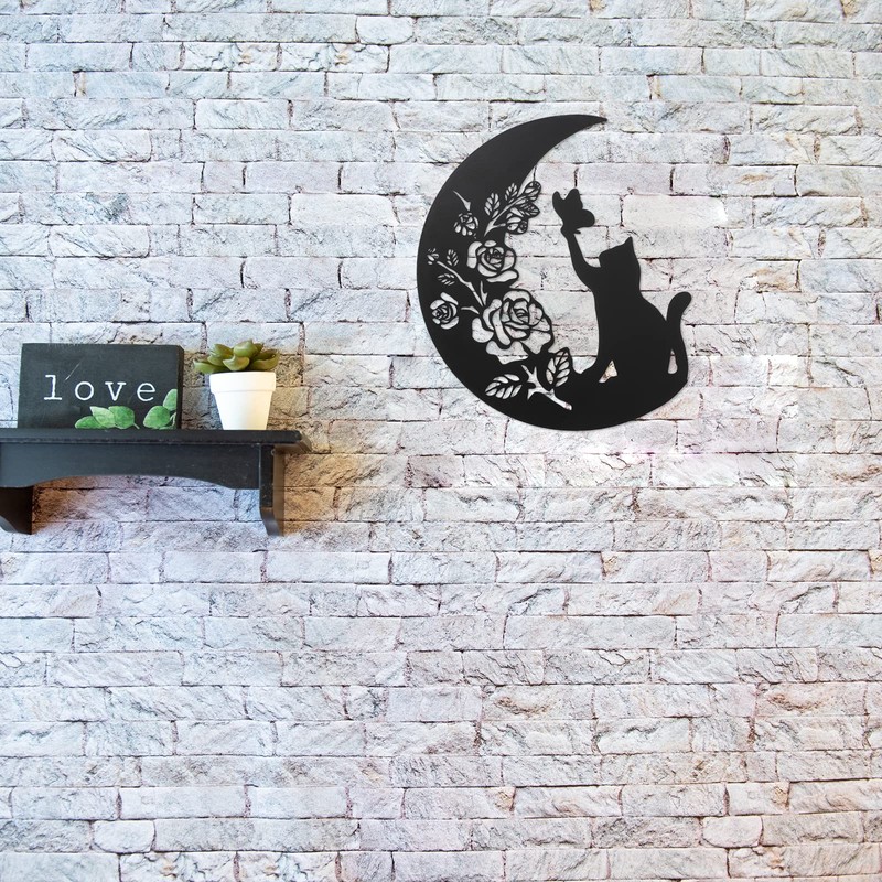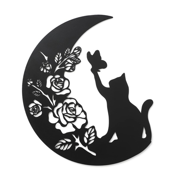 Scwhousi Metal Black Cat Wall Decor, Cat On the Moon Wall Art,Cat Catch Buttefly Wall Scuplture, Cats Lover Gifts for Christmas