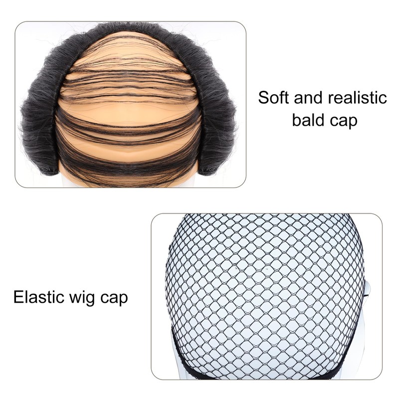 - Package Includes:You will receive 1pcs black bald cap with hair and 1pcs mesh wig cap that can go to meet your Halloween themed party cosplay needs.The bald wig has a very realistic design and the mesh wig cap can make you feel comfortable and breathability,making it a popular choice wig for cosplay.It will make you wear this wig and cosplay as an old man immediately