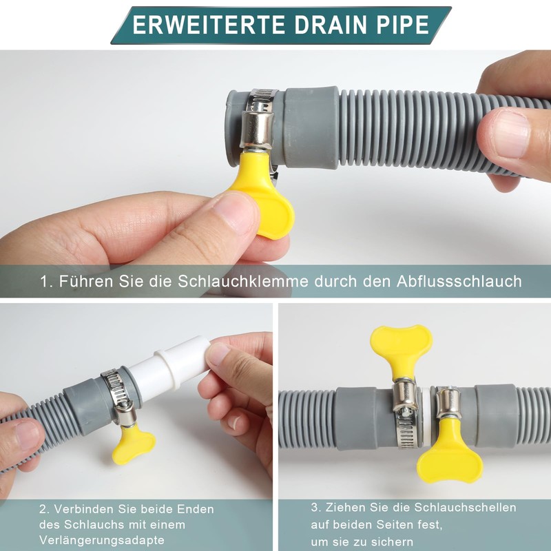 - Easy installation: the installation of the washing machine drain hose is possible without tools. Simply plug in the sewer hose and connect it. For a drain hose extension, add only the adapter and hose clamps.