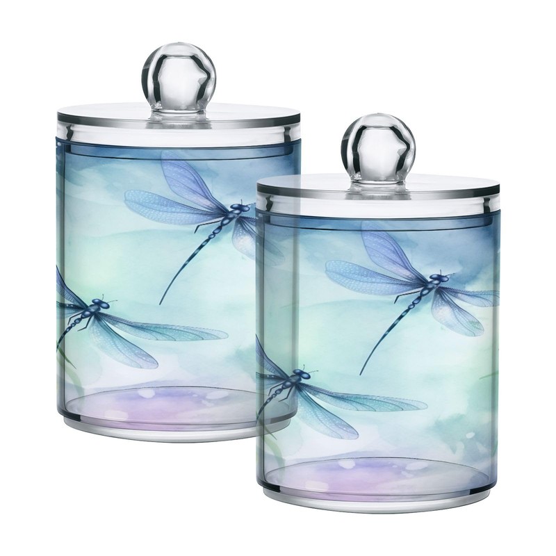 SDMKA 2 Pack Apothecary Jars Bathroom Watercolor Dragonflies Qtip Holder Dispenser Clear Plastic Storage Canister Jar with Lid for Cotton Ball, Cotton Swab
