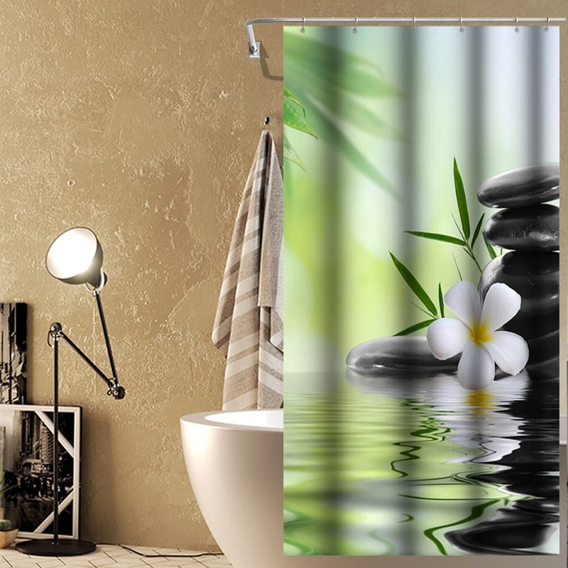 SDOTPMT 90 x 183 cm Water Spa Shower Curtain Green Bamboo Leaves Orchid Blossom Natural Bath Curtain Zen Meditation Basalt Stones Flowers Bath Curtain for Children Bathroom Polyester with Hooks