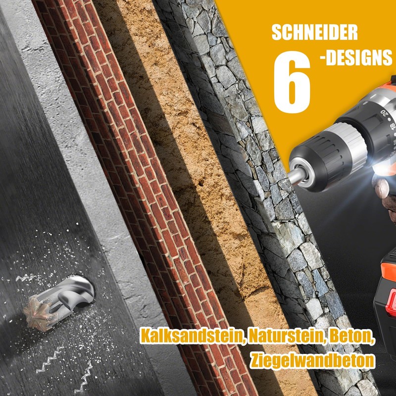 • Thanks to the 6 cutting edges, the drill runs very quietly and the risk of hooking is greatly prevented. Even reinforced concrete does not stop the drill.
