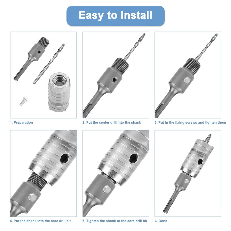 - Inclusive Sets: This set includes a range of core drill bits of 35mm, 40mm, 50mm, 65mm, 80mm, and 110mm, along with SDS+ arbors, guide drills, and a 300mm SDS+ extension shank