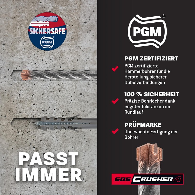 - Highest quality – but safe: the test community wall drill e.V. has certified these concrete drill bits to ensure they meet the highest quality standards. The PGM certification guarantees that the drill bits are manufactured under strict tolerances, allowing safe use of dowels and anchors. This makes the drill a reliable companion on any construction site, especially in the professional sector and in hard applications.