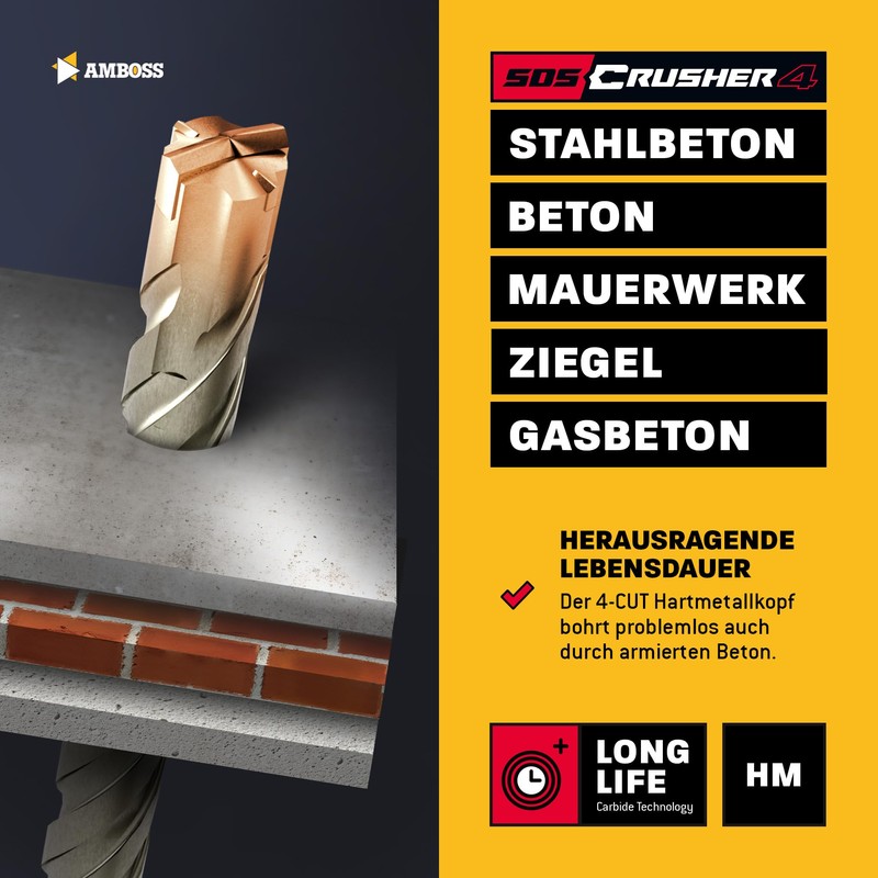 SDS Plus Hammer Drill Bit 4 x Cutting PGM Diameter 12.0 mm x 232 mm - Amboss Werkzeuge SDS Crusher 4 - HM Concrete Drill Carbide Professional Drill Bit 12.0 mm x 232 - Masonry Drill Bit Reinforced