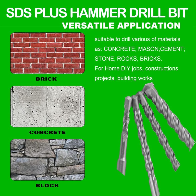 • Material: SDS Plus drill bits are usually made of high-quality materials such as tungsten carbide, which is known for its hardness and durability. This material is good for drilling into hard materials such as concrete, masonry and stone.