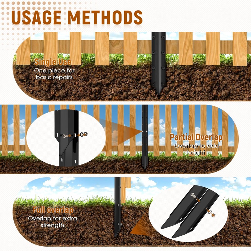 • Overlapping Usage: Fit any fence shape or size without the need for digging holes or pouring concrete; Customize the length and thickness by overlapping the repairs for perfect fit