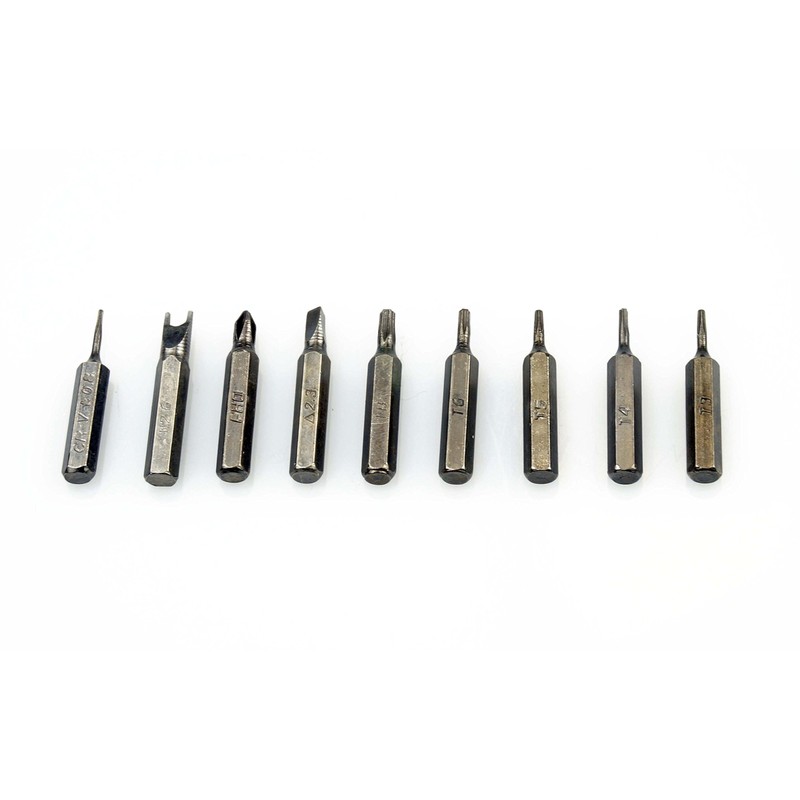 SE is proud to bring you our 10-Piece Precision Screwdriver Set, featuring: (1) Aluminum Magnetic Bit Holder Handle with Bit Storage and Pocket Clip (9) Different Bits Made with CRV Steel **9-Piece Bit Set Includes:** Torx Sizes: T3, T4, T5, T6, T8* Phillips Size: PH0 Spanner Size: 2.6 Triangle Size: 2.3 Star Size: 0.8 * T8 bit can be used on your Xbox PlayStation controller These bits are crafted with precision to allow the best possible driving connection to the screw. Unscrewing the bottom of this screwdriver reveals a chamber just large enough to place all the bits inside, ensuring your set stays complete for an extended amount of time. This unique and brilliant screwdriver set is a must-have for those who find themselves needing a variety of bit shapes for multiple projects. It can be kept as a complete single unit that is ready to use every time you reach for it. SE is committed to providing the customer with the best source for value possible on the market. You will enjoy the quality, function and usefulness of our SE 7504SD 10-Piece Precision Screwdriver Set. **IPR Rights Notice:** Important: Avoid getting counterfeit items. Genuine SE products come with the SE logo on the packaging. Xbox is a registered trademark of PlayStation, Inc. SE is a registered trademark protected by US Trademark Law.