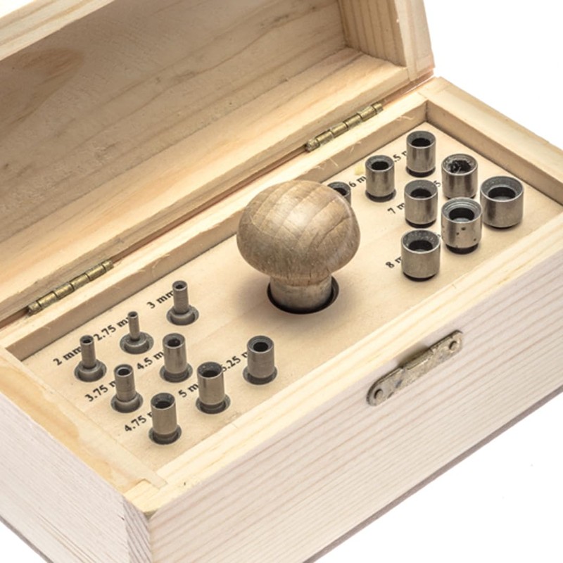 PRODUCT FEATURES: -(16) Punches in the following sizes (mm): ○ 2.00 ○ 2.75 ○ 3.00 ○ 3.75 ○ 4.50 ○ 4.75 ○ 5.00 ○ 5.25 ○ 5.50 ○ 6.00 ○ 6.50 ○ 7.00 ○ 7.50 ○ 8.00 ○ 8.50 ○ 9.00