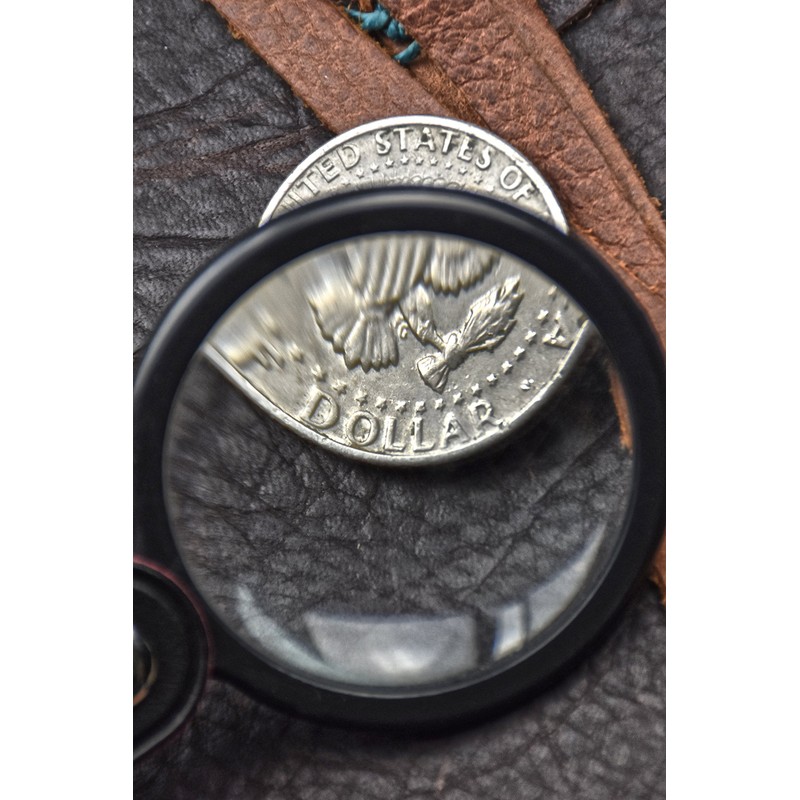 The SE 5x Folding Pocket Magnifier with 1-1/2" Glass Lens Diameter is compact sized and has a magnification power of 5x and glass lens diameter of 1-1/2". It features a black plastic body and rim. It is attached to a black vinyl cover with felt lining to protect it from dust.