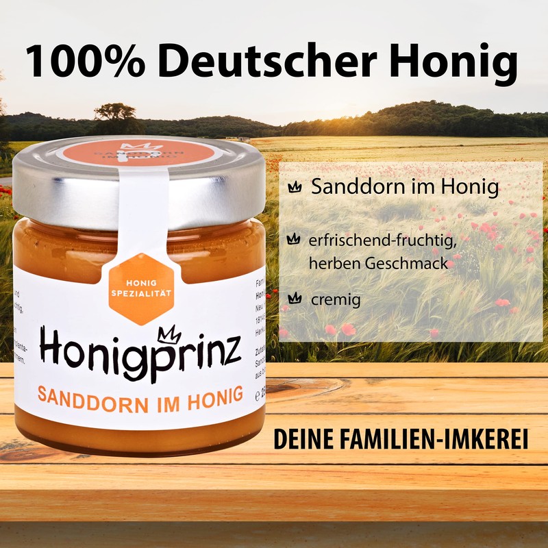 - Something for every taste: In addition to our sea buckthorn in honey, we also have other delicious varieties such as rapeseed honey, early traditional honey, forest blossom honey, summer blossom honey, linden honey, acacia honey, raspberry blossom honey, heather honey, forest honey, buckwheat honey or cornflower honey. In our honey varieties there are no artificial additives such as flavours, preservatives, dyes or flavour enhancers.