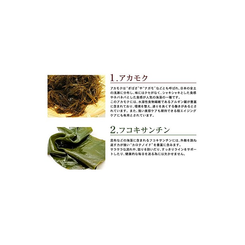 - Acamok is also known as "jibasa" and "nagamo" which are distributed in shallow water throughout Japan and has no addictive taste and is a popular seaweed with a crisp texture and a never-biting texture. This acamok is rich in Alginic Acid, a water-soluble dietary fiber, which is said to help improve the environment and improve the street. It is also useful for aging care as well as strong beauty care. Recently, it is said to be good for diet support because it is also expected to work as a combustion system
