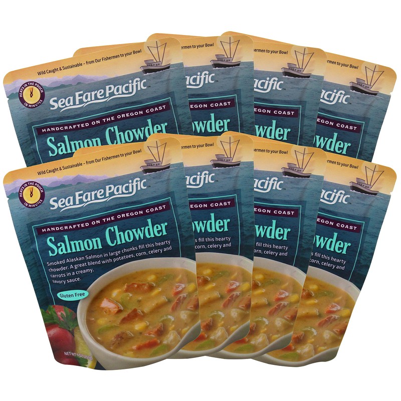 Wild, Alaskan Sockeye Salmon fill this hearty and healthy chowder, blended with potatoes, corn, celery, carrots and onions in a creamy sauce. Made with gluten free and non-GMO ingredients, the chowder is ready to eat after only 90 seconds in the microwave! Developed at Oregon State University's Sea Grant program and seafood lab in Astoria, Oregon, this chowder has outstanding flavor as well as health benefits. Each serving contains 7 grams of protein and lots of heart healthy omega-3 fatty acids, the perfect choice that doesn't sacrifice health for convenience. With the option of simply heating for 90 seconds in the microwave, on the stove top or in boiling water, this soup is ready to eat right out of the pouch. Packaged in an easy-to-open, BPA-free pouch with a two year shelf life, the chowder is made with gluten free and non-GMO ingredients only. Wild caught out of Alaskan waters, the red sockeye salmon found in these pouches is listed on Monterey Bay Aquarium's Seafood Watch's Super Green List, making this meal an earth friendly choice as well as a health friendly one. All processing and packaging takes place in Coos Bay, Oregon.