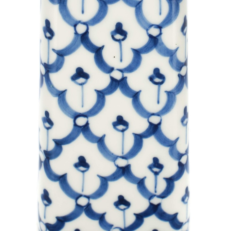 - Vase is made of porcelain ceramic with glossy blue and white finish; Has a round little lip which helps secure stems