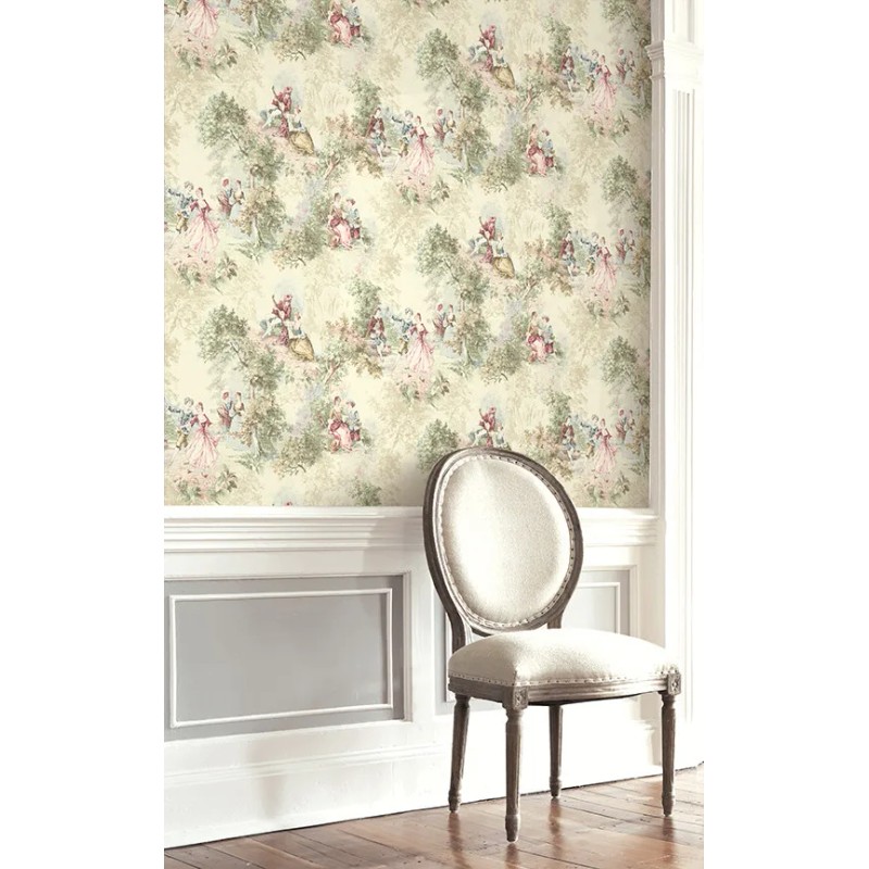 Seabrook Wallpaper French Toile Faux Tapestry Green Blue Red Pink on Cream, 60 sq ft Bolt