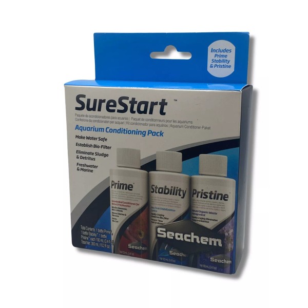 The Seachem SureStart kit comes with three bottles: Prime, Stability, and Pristine. Put simply, Prime conditions the water; Stability establishes the aquarium’s biofilter; Pristine improves water clarity. We highly recommend this pack to both new and seasoned aquarists. This set takes the guesswork out of giving your fish clean, healthy water!
