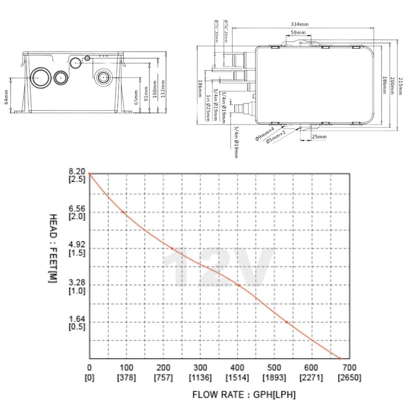 - Flow capacity: 750 Gallons per hour ( 2838 Litres per hour), 12 Volts DC