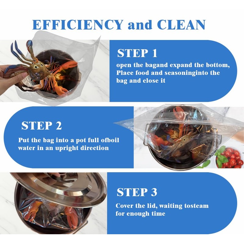 - Easy to Use - Just put food and seasoning into the seafood bags to place them into a pot full of boil water in an upright direction, then you can wait to steam for enough time and enjoy delicious food easily.