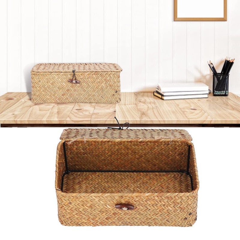 Seagrass Baskets, Hand Woven Seagrass Storage Containers with Lid, Rectangular Multi-Purpose Shelf Baskets, Household Boxes with Buckle, Small Rustic Container (M)