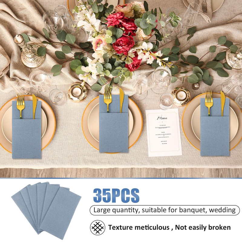 Seajan 35 Pieces Pocket Napkins, Linen Feel Napkins, Disposable Airlaid Paper Napkins Prefolded Dinner Napkins with Built in Flatware Pocket for Silverware Wedding Party(Dusty Blue)