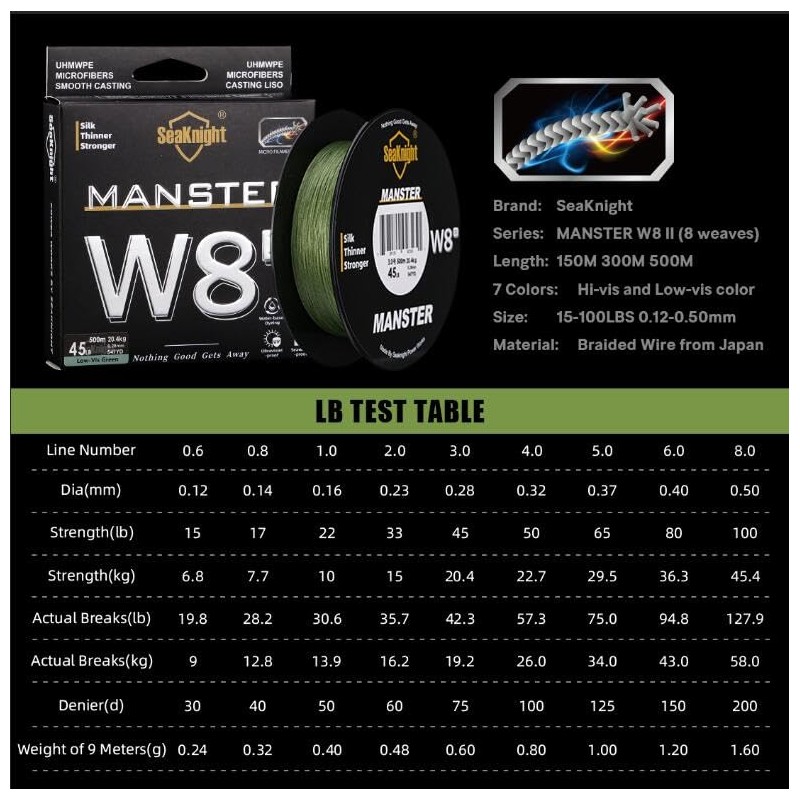- 8 Braided PE Strands - UHMWPE fiber gives the fishing line its extremely high resilience. The improved wide angle technology makes the fishing line more round, preventing tangling.