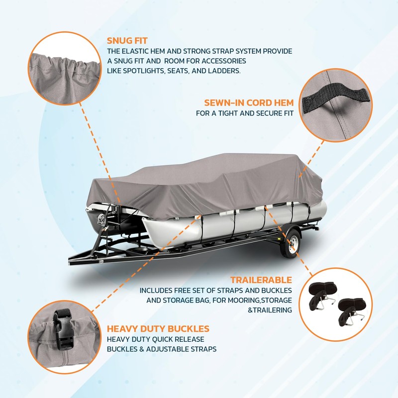 - 𝗦𝗡𝗨𝗚 𝗙𝗜𝗧: Built in elastic hem around the perimeter and heavy duty strap and buckle system gives a secure and snug fit while providing enough room for accessories such as spotlights, seats and boarding ladders.