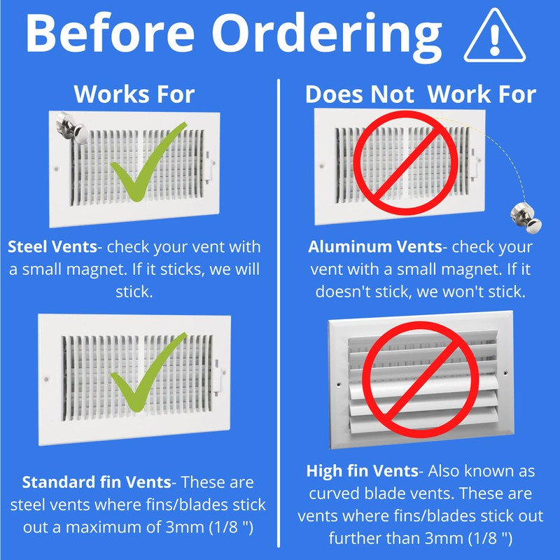 - WARNING Not all metal vents are magnetic. Not for aluminum/high vents. See listing pic 5 for details