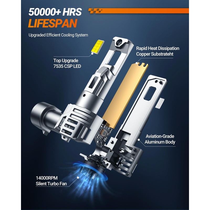 - 50000+ Hours Lifespan: Equipped with a 13000RPM high-speed cooling fan, the 9005 bulbs offer exceptional heat dissipation, providing over 50,000 hours of reliable illumination and smooth operation.In addition, IP67 waterproof technology can make it use in a variety of weather