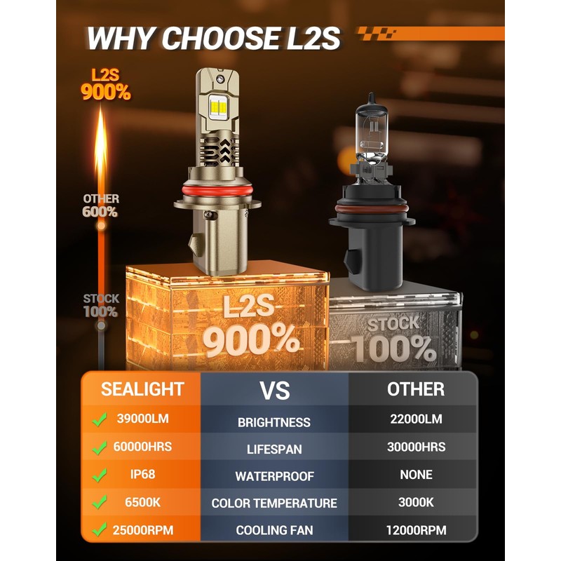 - 【Brightness 900%】 SEALIGHT 9007 led headlight bulb 6500K white fog lights are glare-free and have no blind spots. The brightness is 9 times that of the original bulbs. They allow you to have a clearer and broader view while driving