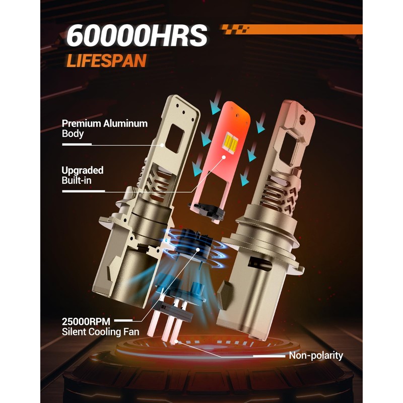 - 【Longer Lifespan】 HB5 9007 light bulbs use aviation aluminum as the main body and are equipped with ultra-high-speed fans to maximize the cooling of components. They ensure continuous illumination for over 60,000 hours