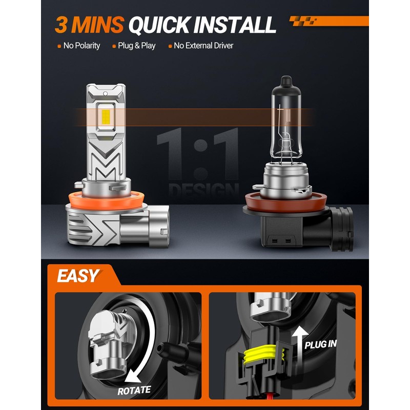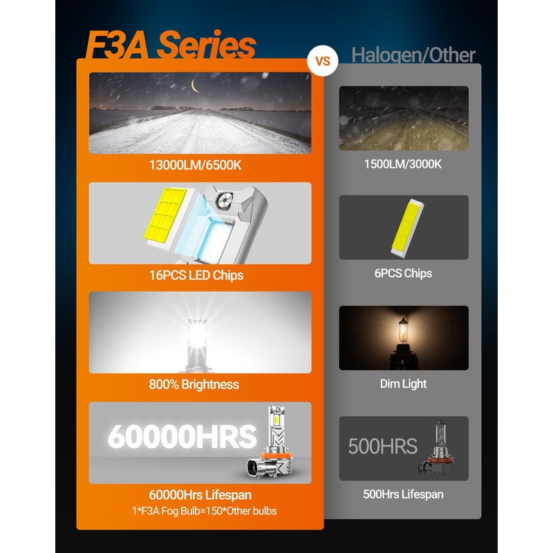 - 1:1 Size & 3-Minute Install: The F3A series h16 led fog light bulb feature a plug-and-play design, ensuring h11 led fog light bulb can be easy installation without tools. Designed for a seamless fit, the 1:1 fog lights led replacement eliminates the need for adapters or modifications, providing a perfect match for your vehicle