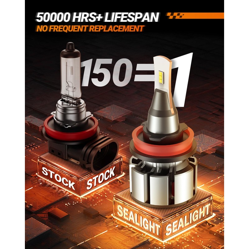 SEALIGHT H9/H8 Bulbs, 36000LM 800% Ultra-Brightness, Real 1:1 Halogen Mini Size, 10-Year Extended Lifespan, 6000K White Illumination for Automotive L2 H11 Fog Lights, Plug and Play, Pack of 2