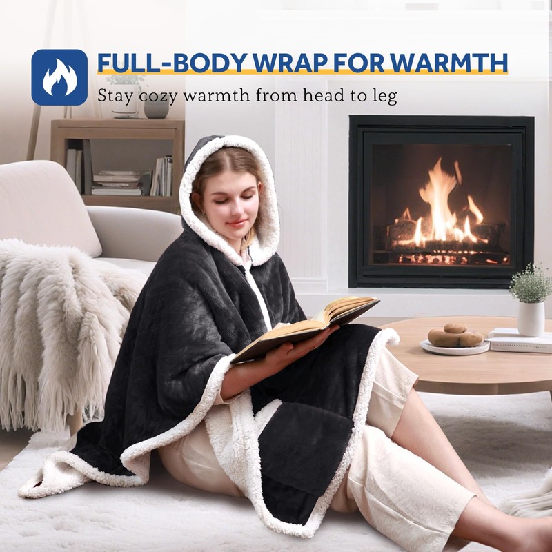 The electric blanket hoodie poncho provides thoughtful warmth for every moment. The electric throw hoodie poncho wraps around you like a soft scarf, freeing you from the burden of heavy hats in cold winters. The cozy hand-warming pockets on both sides not only keep your hands warm but also offer convenient storage, keeping small essentials within easy reach. The innovative buckle design ensures 360° snug wrapping, completely freeing your hands while creating a sealed warmth that efficiently locks in heat.
