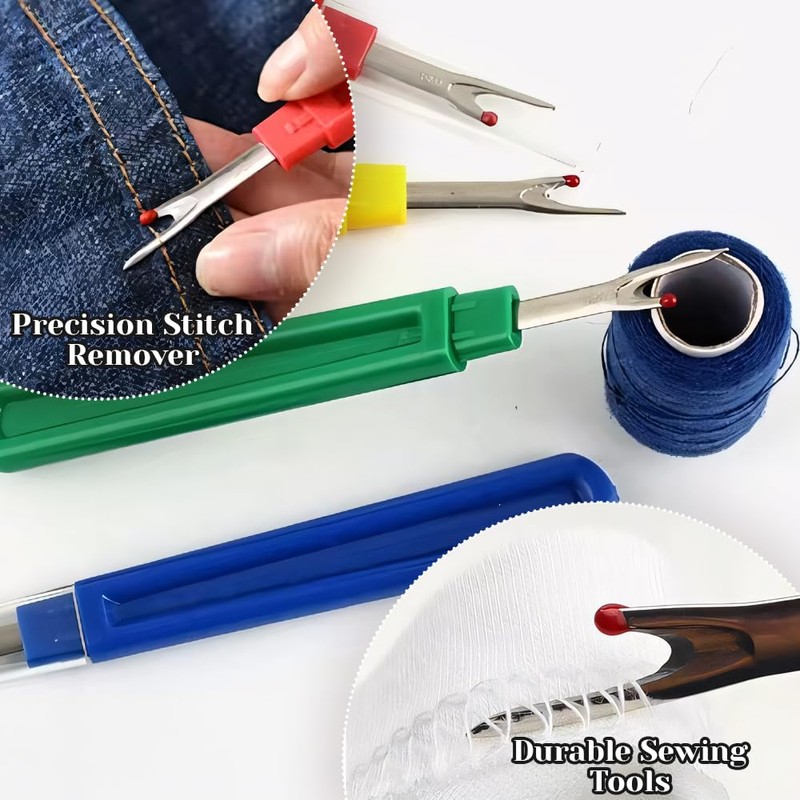 - Multi-functional: Our kit comes with 4 large and 4 small seam rippers, locating pins for sewing needle DIY crafts and yarn scissors, making it perfect for sewing and crafting enthusiasts. The brightly colored plastic handles with sturdy metal tear-off forks and a clear plastic cover provide an ergonomic grip that is comfortable to hold