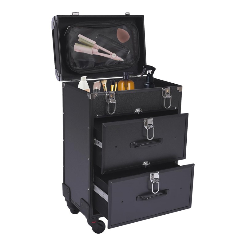 This rolling make up case is suitable for professional make-up artists, hairdressers, nail technicians, and beauticians in beauty centers, salons, private homes, parties, and other occasions.