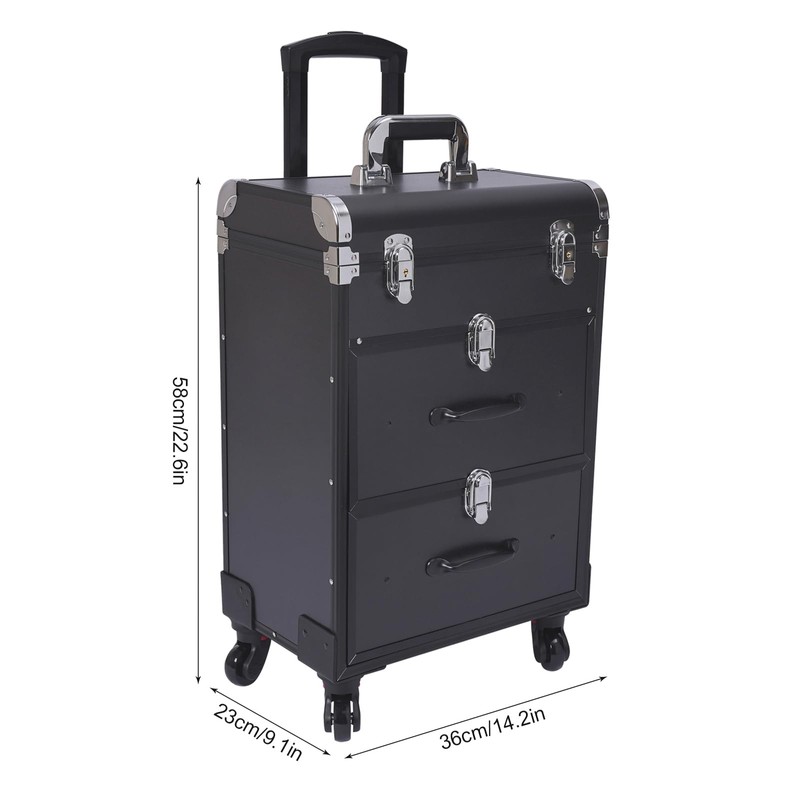 SEANESZTI 3 in 1 Rolling Makeup Train Case, Salon Barber Case Traveling Cart Trunk, Makeup Case Cosmetic Trolley Organizer Travel Case, Aluminum Trolley Professional Cosmetic Organizer Box, Black