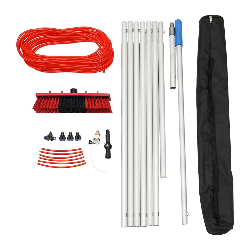 - 【65-foot water hose】The 20m/65-foot water hose can easily meet the rinsing and cleaning needs at different heights. In addition, its anti-freeze feature ensures its long service life. This water fed pole kit is also equipped with a lightweight brush head with 2 water outlets and its durable and soft bristles ensure safe cleaning of various surfaces.
