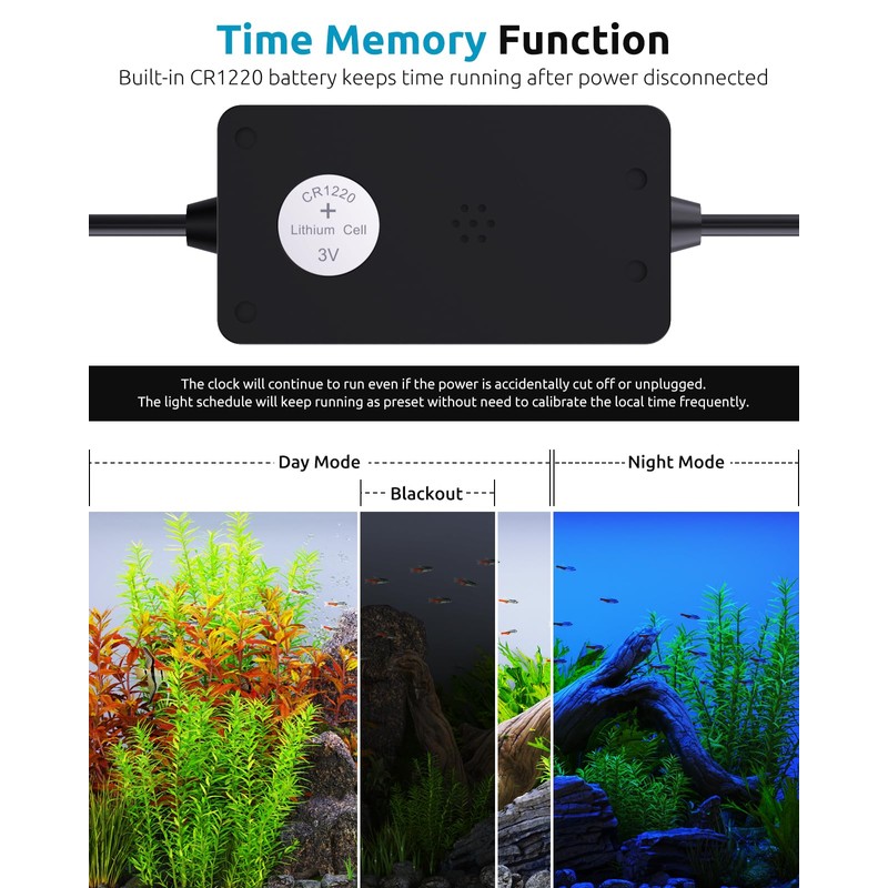- 🐟 Time Memory Function: A replaceable battery is featured in the fish light controller to keep the passage of time even if the power is cut off unexpectedly. The aquarium planted light will follow the schedule timely when power restored after a tank cleansing or a blackout. No need to set and calibrate the timer repeatedly.