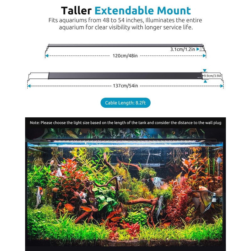 - 🐟 Taller Extendable Bracket: Seaoura aquarium lights came with adjustable mount, application size: 48'' to 54'', fit the light on 50 gallon to 120 gallon fish tanks. The taller stand design ensures the light covers every corner of the aquarium while extending its service life. Cable Length: 8.2ft.