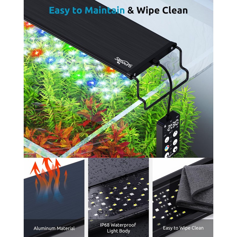 - 🐟 IP68 Waterproof: Seaoura aquarium planted light is easy to maintain and wipe clean featuring a IP68 waterproof light body. Combined aluminum shell and PC material brings better water and heat resistance to the lights body. Solid and durable for 24/7 routine.