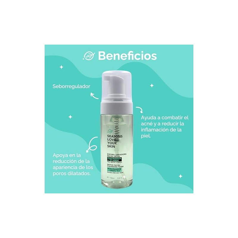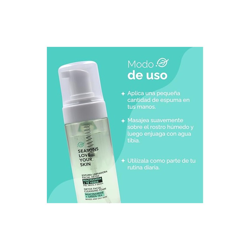 SEASONS LOVE YOUR SKIN - seasons love your skin espuma limpiadora facial con niacinamida té verde para piel mixta a grasa o con acné 150 ml. 💎 Fórmula premium para resultados visibles y duraderos. Ingredientes naturales seleccionados y testado dermatológicamente. 🏆 Recomendado por expertos. Ideal para quienes buscan lo mejor en calidad y estilo. Producto auténtico con satisfacción total asegurada. ¡No te quedes sin el tuyo y aprovecha esta oportunidad única!
