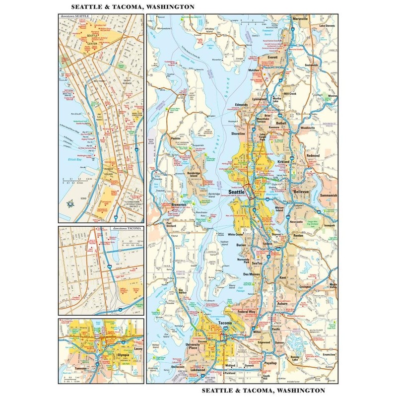 - Bainbridge Island, Bremerton, Bellevue, and Everett are among the cities surrounding Seattle that are featured on the Seattle regional map. The highly detailed insets of central Seattle and Tacoma show highways, streets, parks, landmarks, and other points of interest. The Seattle Center, Belltown, and Pioneer Square are among the neighborhoods featured on the downtown Seattle map. Also available in a large size of 29.00" high X 22.50" wide