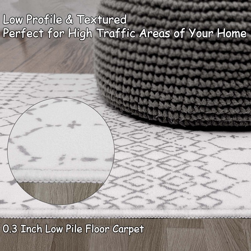 - [Low Profile & Comfortable Rug] Functional 0.3” pile height allows for convenient placement in entryways and underneath furniture. This modern carpet rug has a soft texture, providing great comfort. Whether you step on with bare feet or laying on with your children or pets, you can feel the warmth and coziness underneath.